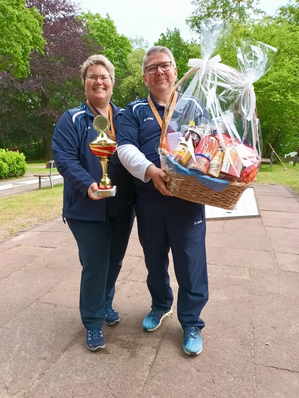Es gibt aber einen Wettbewerb in Cuxhaven, welcher sonst nirgends ausgespielt wird. Es ist eine Wertung für gemeldete Ehepaare. Hier musste man 2023 noch den Sieg Dirk und Sabine Otten überlassen, da man einen Schlag mehr benötigte. Dieses Jahr aber gewannen Britta und Christian den Titel mit großem Vorsprung. Als Geschenk wurde ein groß gefühlter Präsentkorb überreicht.